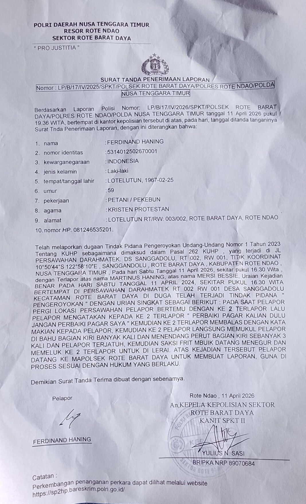 Korban, Ferdinand Haning, melaporkan peristiwa tersebut ke pihak kepolisian dengan nomor laporan: LP/B/17/IV/2026/SPKT/Sek Rote Barat Daya/Polres Rote Ndao/Polda Nusa Tenggara Timur.