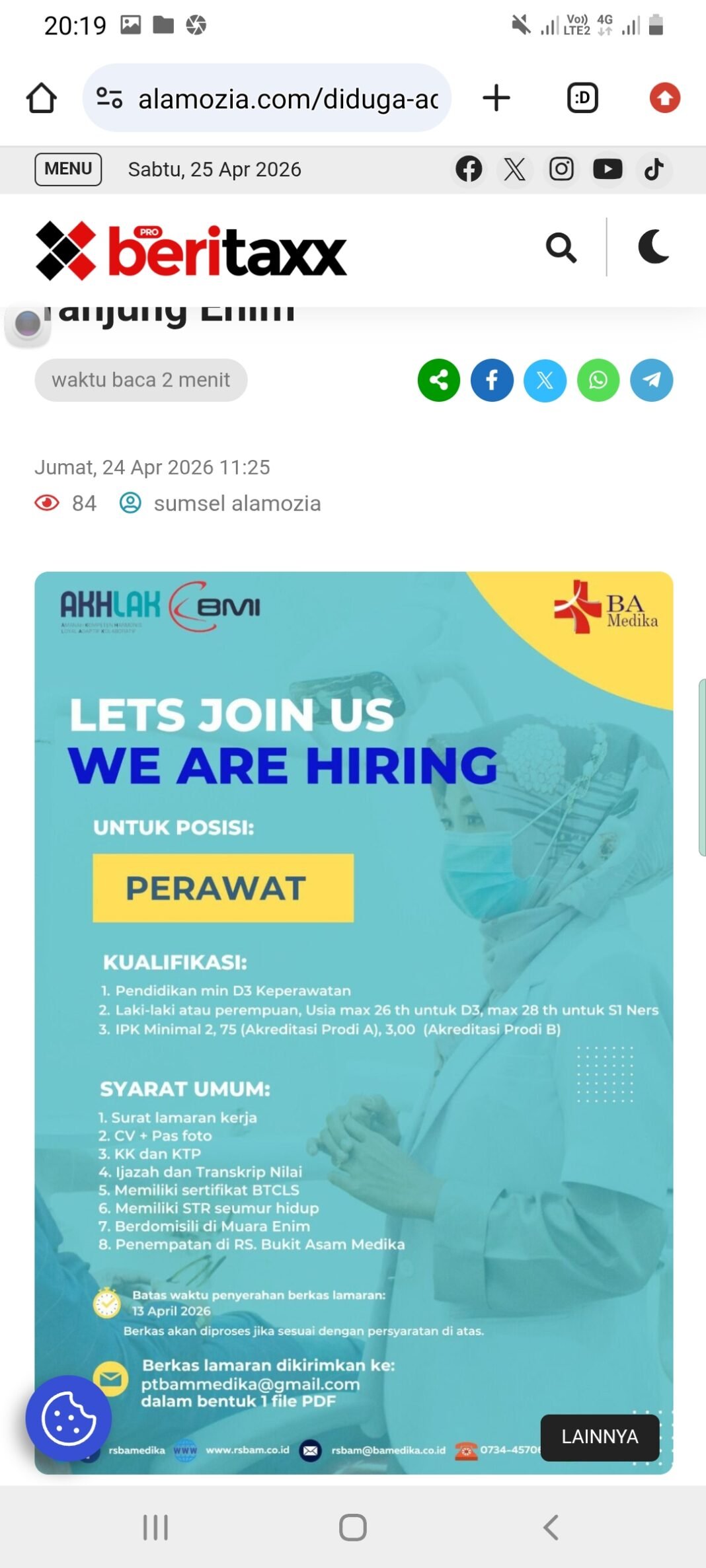 Tanjung Enim,Kompas.sbs -Proses rekrutmen tenaga medis perawat di Rumah Sakit Bukit Asam Medikal (RSBAM) yang beralamat di Jalan Raya Bukit Asam No.118, Tanjung Enim, Kecamatan Lawang Kidul, Kabupaten Muara Enim, Sumatera Selatan, diduga menyisakan sejumlah kejanggalan. Hal ini mencuat pada Jumat (24/05/2026).