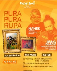 Sementara itu, pameran “Pura Pura Rupa” menghadirkan karya dua seniman, Nanek dan Bang Black, yang menampilkan eksplorasi visual dengan pendekatan reflektif dan karakter kuat,Pameran ini berlangsung hingga 30 April 2026 di North Art Space, menyuguhkan kombinasi art exhibition, live music, hingga sesi diskusi terbuka.