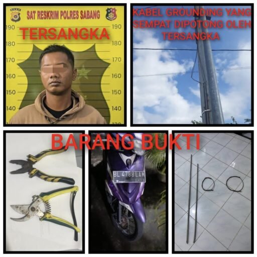 barang bukti yang diamankan berupa, 1 unit sepeda motor Yamaha Mio J warna ungu, 1 buah tang, 2 (dua) buah pipa pelindung kabel, 2 buah gulungan kabel grounding, Atas perbuatannya, tersangka dipersangkakan melanggar Pasal 477 ayat (1) huruf f Jo Pasal 17 ayat (1) dan ayat (3) UU Nomor 1 Tahun 2023 tentang KUHP, dengan ancaman hukuman kurungan penjara selama 4 tahun 8 bulan, atau ⅔ dari ancaman pidana pokok 7 tahun penjara.