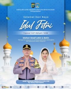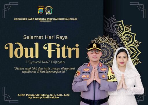 KARO SUMUT,Kompas.SBS| Kapolres Tanah Karo AKBP Pebriandi Haloho, S.H., S.I.K., M.Si didampingi Ny Nanny Andi Haloho mengucapkan Selamat Hari Raya Idul Fitri 1 Syahwal, 1447 Hijriyah atau Lebaran 2026.