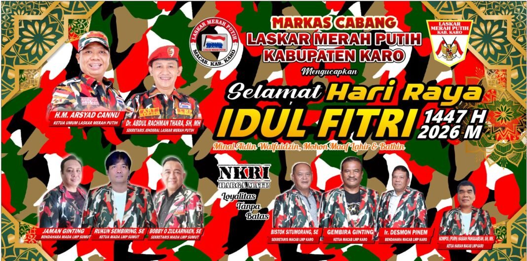 KARO SUMUT,Kompas.SBS| Dalam rangka merayakan Hari kemenangan, Hari Raya Idul Fitri 1447 Hijryah atau Lebaran 2026, Markas Cabang Laskar Merah Putih ( MACAB LMP) Kabupaten Karo mengucapkan selamat Idul Fitri kepada seluruh masyarakat Kabupaten Karo, terkhususu bagi saudara saudara kami Muslim, selamat merayakan hari penuh kemenangan ini.