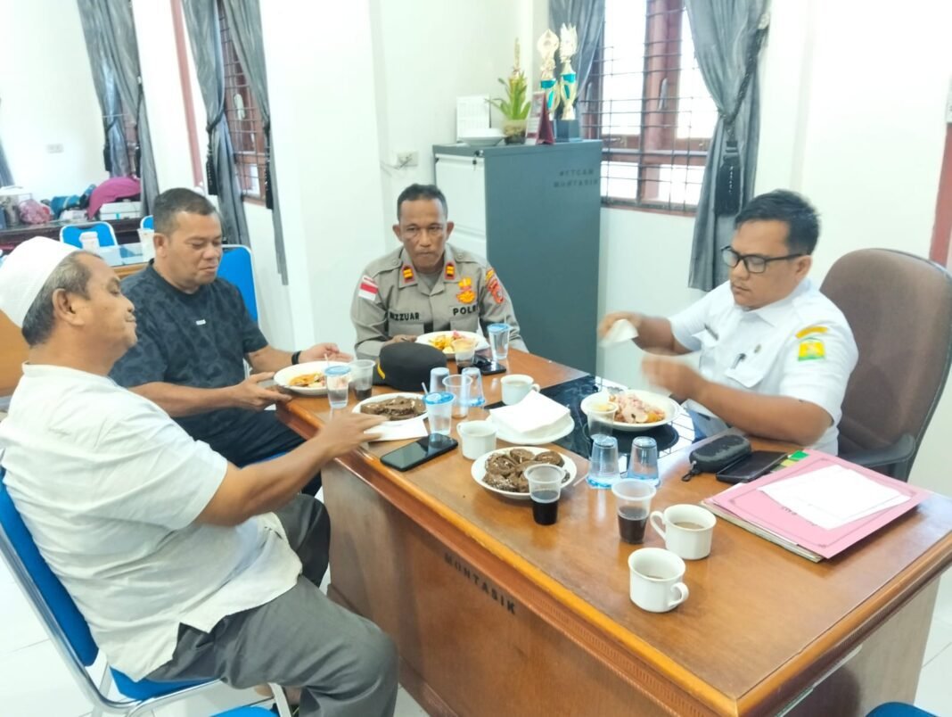 Camat Montasik, Afrizal, S.E, yang mengenakan pakaian dinas putih, membuka langsung kegiatan tersebut dengan nuansa sederhana namun sarat makna. Silaturahmi dikemas dalam bentuk halal bihalal dan makan bersama, sekaligus menjadi ruang dialog santai antar unsur Forkopimcam dan masyarakat.