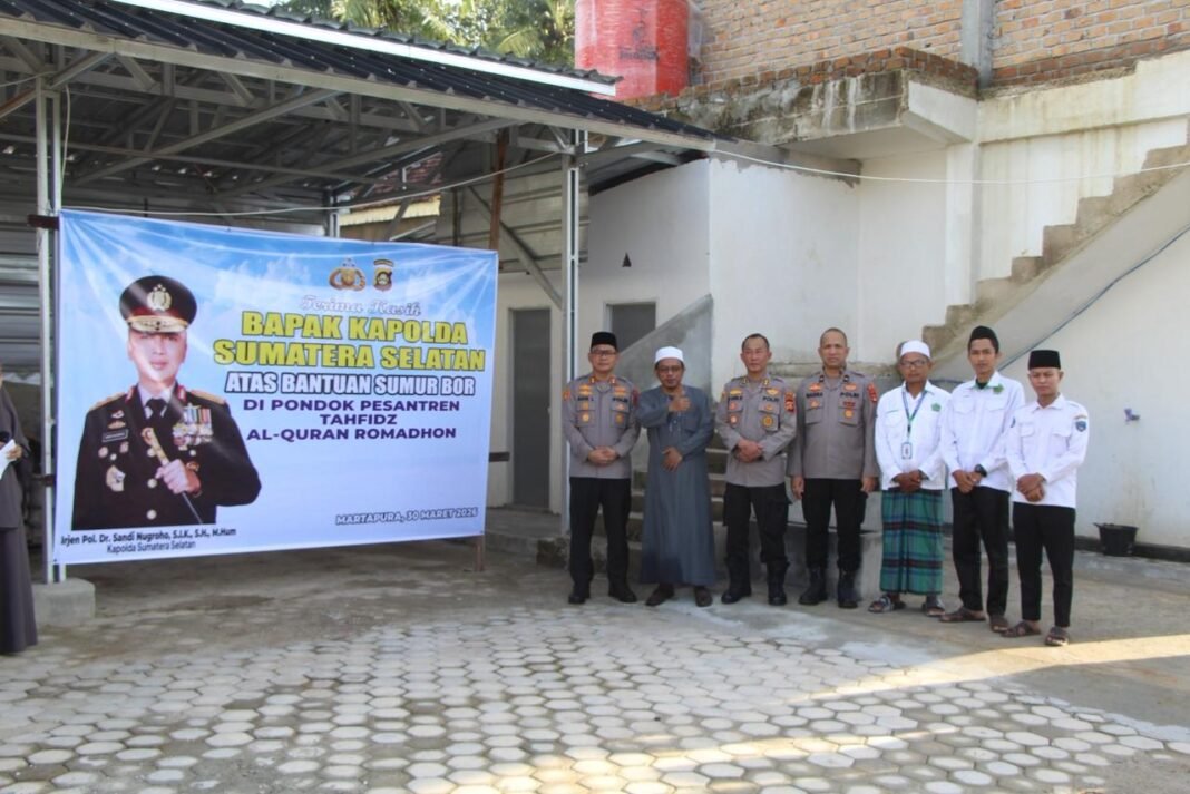 Palembang – kompasSBS.com – Polda Sumatera Selatan menunjukkan komitmen kepedulian sosial melalui program bantuan kemasyarakatan yang menyentuh langsung kebutuhan masyarakat. Salah satunya diwujudkan melalui pemberian bantuan sumur bor kepada Pondok Pesantren Tahfizh Romadhon serta dukungan pembangunan Rumah Al-Qur’an Al-Ilmu di wilayah Martapura, Kabupaten Ogan Komering Ulu Timur. Kapolda Sumatera Selatan, Sandi Nugroho, menginisiasi program bantuan tersebut sebagai bagian dari implementasi Polri yang hadir, peduli, dan memberikan manfaat nyata bagi masyarakat, khususnya di bidang keagamaan dan pendidikan. Kegiatan di lapangan diwakili oleh Kapolres OKU Timur, Adik Listiyono, yang meresmikan langsung penggunaan sumur bor di Ponpes Tahfizh Romadhon, Kotabaru, Martapura.