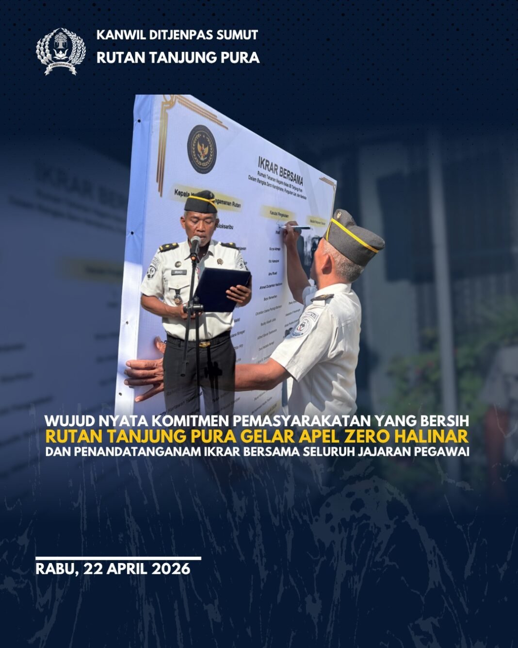 Rumah Tahanan Negara (Rutan) Kelas IIB Tanjung Pura menggelar Apel Zero HALINAR dan Penandatanganan Ikrar Bersama di Lapangan Apel Rutan, Rabu (22/4/2026). Kegiatan ini merupakan implementasi program nasional Direktorat Jenderal Pemasyarakatan untuk mewujudkan lembaga yang bebas dari tiga masalah utama: Handphone ilegal, Pungutan Liar (Pungli), dan Narkoba (HALINAR).