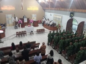 Kota Bitung, Kompas :Dalam rangka pembinaan mental (Bintal) kejuangan, para siswa Sekolah Calon Tamtama (Secata) Rindam XIII/Merdeka melaksanakan kegiatan ibadah Subuh bersama jemaat di Gereja Kharisma.