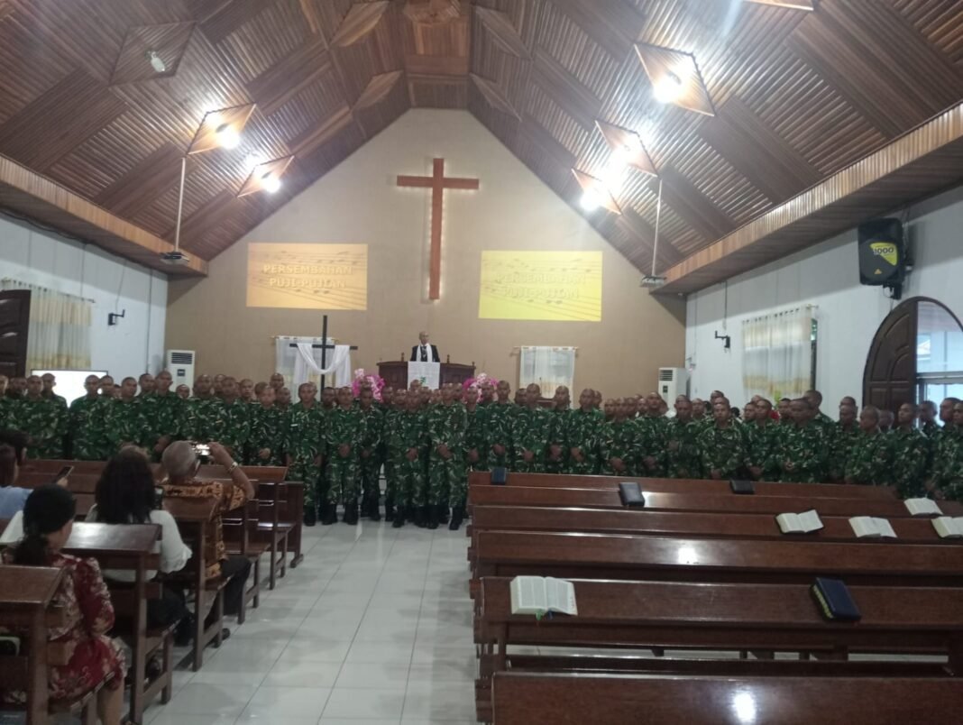 Kegiatan ibadah di gereja kharisma secata Rindam Xlll/Merdeka tepatnya di Wangurer Tim., Kec. Madidir, Kota Bitung, Sulawesi Utara, Minggu (19/04/2026).