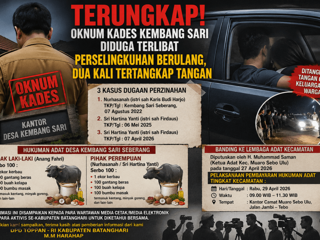 Batanghari, kompas sbs.Id – Dugaan pelanggaran moral yang menyeret nama Kepala Desa Kembang Sari, Kecamatan Muaro Sebo Ulu, Kabupaten Batanghari, AF, kian menjadi sorotan publik. Oknum kepala desa tersebut diduga terlibat dalam praktik perselingkuhan hingga perzinahan dengan istri orang.