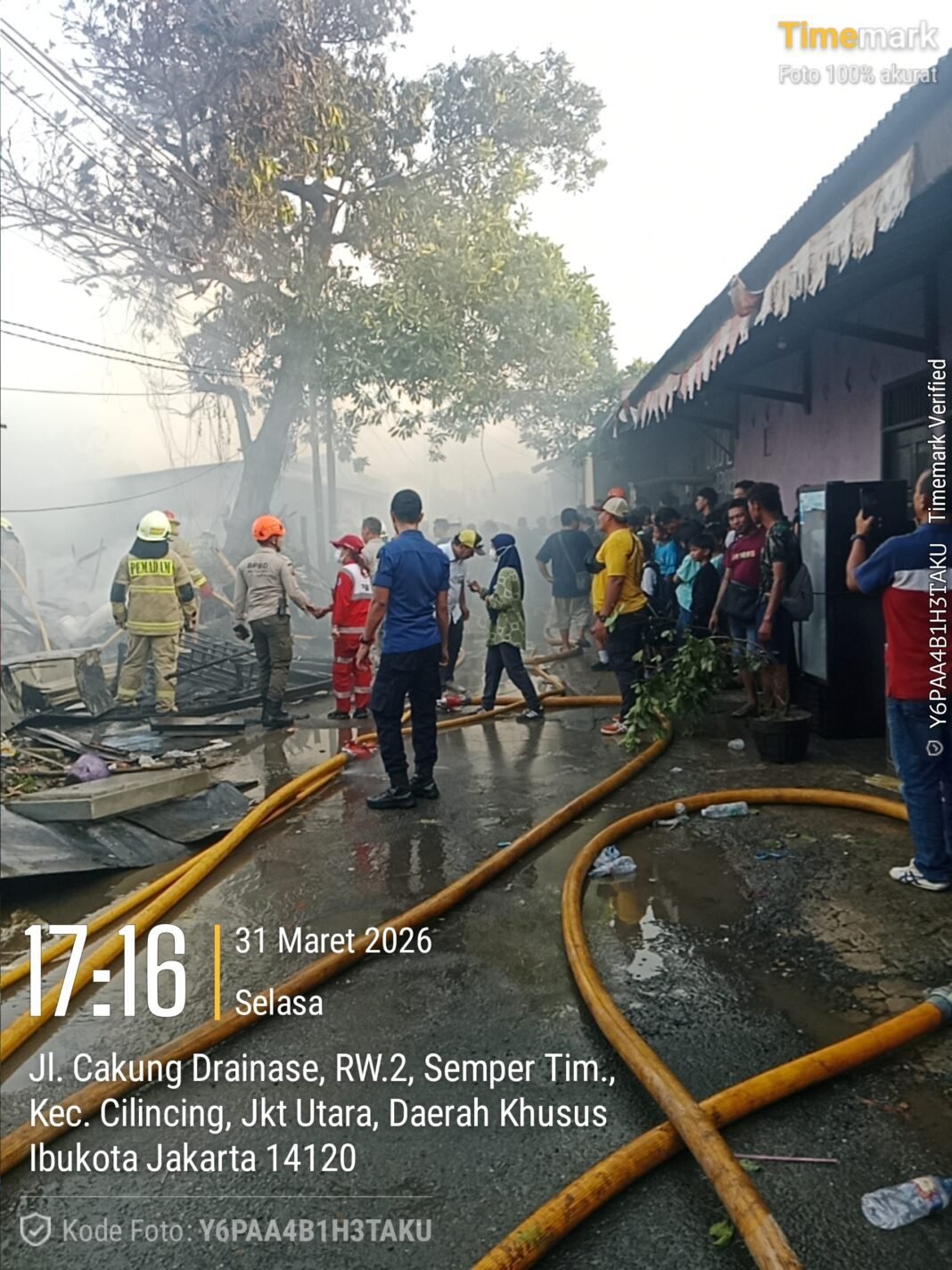 JAKARTA UTARA, 31 Maret 2026 – Sebuah rumah tinggal berbahan kayu dan papan di kawasan Jalan Rawa Malang, Jalan Cakung Drainase RW 02, Kelurahan Semper Timur, Kecamatan Cilincing terbakar pada hari ini sekitar pukul 17:16 WIB. Meskipun bangunan hancur total akibat api, tidak ada korban jiwa atau luka berat yang dilaporkan.